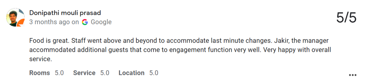 Food service was also appreciated by the guest.