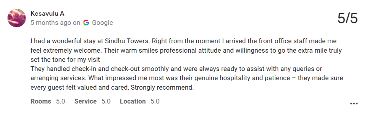 So let us sit like two friends having tea and go through what people actually said about Hotel Sindhu Towers. Not promotional talk. Real guest reviews. Real stay experiences.
