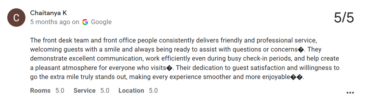 According to his review, the front desk team continuously delivers friendly and professional service. Even during busy check in times, the staff manages communication clearly and keeps the atmosphere pleasant.